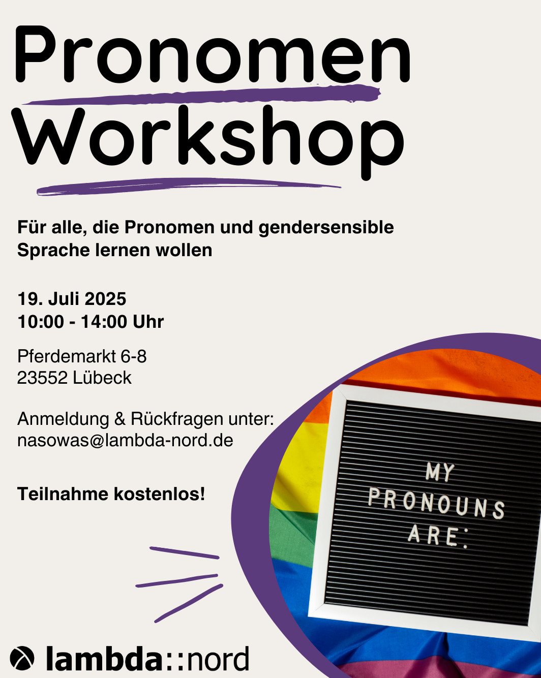 Willkommen auf unserer Homepage von lambda::nord für queere junge Menschen im Norden! Wir sind ein queeres Jugendnetzwerk für junge LSBTIQA+ in Schleswig-Holstein und Hamburg. Wir unterstützen queere junge Menschen bis 27 Jahre, schaffen Safer Spaces und setzen uns für Vielfalt und Akzeptanz ein.